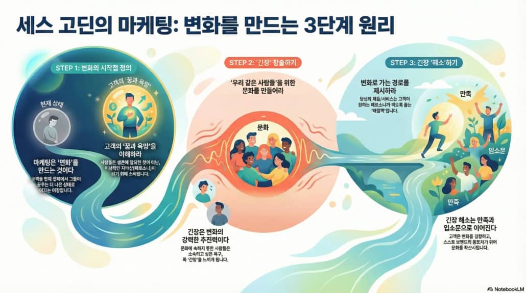 예를 들어, 우리가 흰색 티셔츠를 판매한다고 하자. 기존의 마케팅은 모델에게 옷을 입히고 “이 제품을 사세요”라고 말한다. 하지만 세스 고딘의 방식은 다르다. 그는 평범한 사람들이 그 티셔츠를 입고 홍대 거리에서 자유롭게 노는 장면을 보여준다. 이때 소비자는 광고를 보는 것이 아니라, “하얀 티셔츠를 입은 새로운 라이프스타일”을 본다. 그리고 문득 깨닫는다. “나도 저 사람들처럼 자연스러우면서 세련된 느낌을 갖고 싶다.” 이때 생기는 작고 불편한 감정, 즉 ‘내가 아직 그 안에 속하지 못했다’는 긴장이 일어난다. 그리고 그 긴장을 해소하기 위해 티셔츠를 구매한다. 이것이 바로 세스 고딘이 말한 ‘긴장과 해소의 메커니즘’이다.