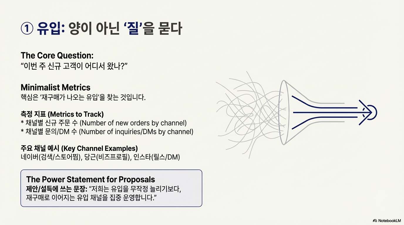 결국 온라인 판매의 핵심은 매출 그래프가 아니라 플라이휠의 회전 속도다. 고객이 들어오고(유입), 경험하고(경험), 다시 돌아오는(재구매) 순환이 안정적으로 돌아갈 때, 비로소 브랜드는 스스로 성장하기 시작한다. 이번 슬라이드는 그 구조를 시각적으로 정리한 개요다. 앞으로 각 단계를 실제 사례와 함께 구체적으로 풀어갈 예정이다.