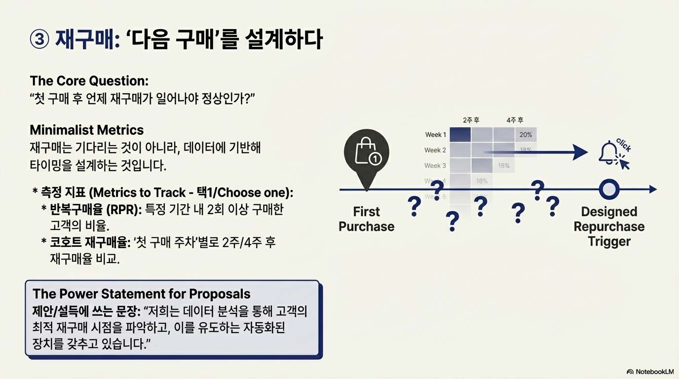 3단계는 재구매 단계(Retain Layer)이다. 한 번의 구매로 끝나는 구조가 아니라, 고객이 자발적으로 돌아오게 만드는 시스템이다. 리마인드 메시지, 리뷰 기반 리워드, 정기배송 같은 형태도 있지만 본질은 ‘기억되는 브랜드’다. 재구매는 기술이 아니라 감정의 연속성에서 나온다. 고객이 ‘다시 찾고 싶은 이유’를 매일 갱신해야 한다.