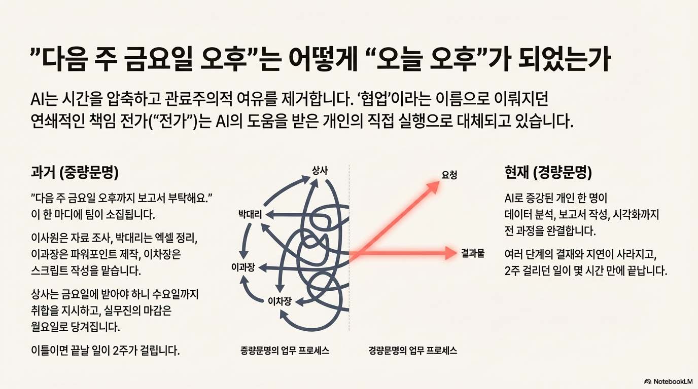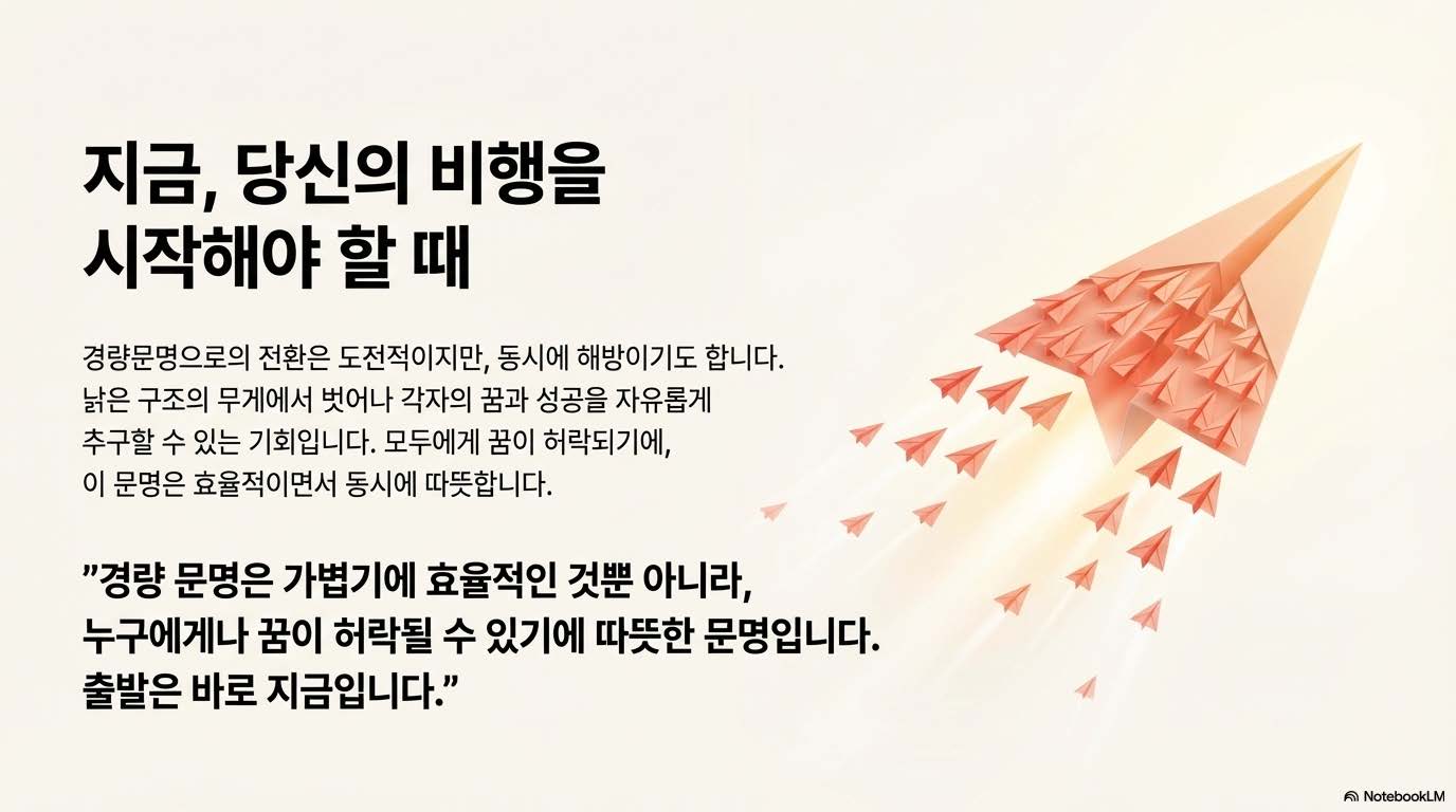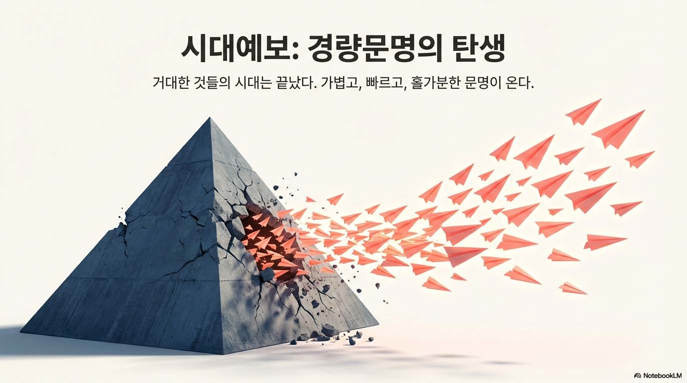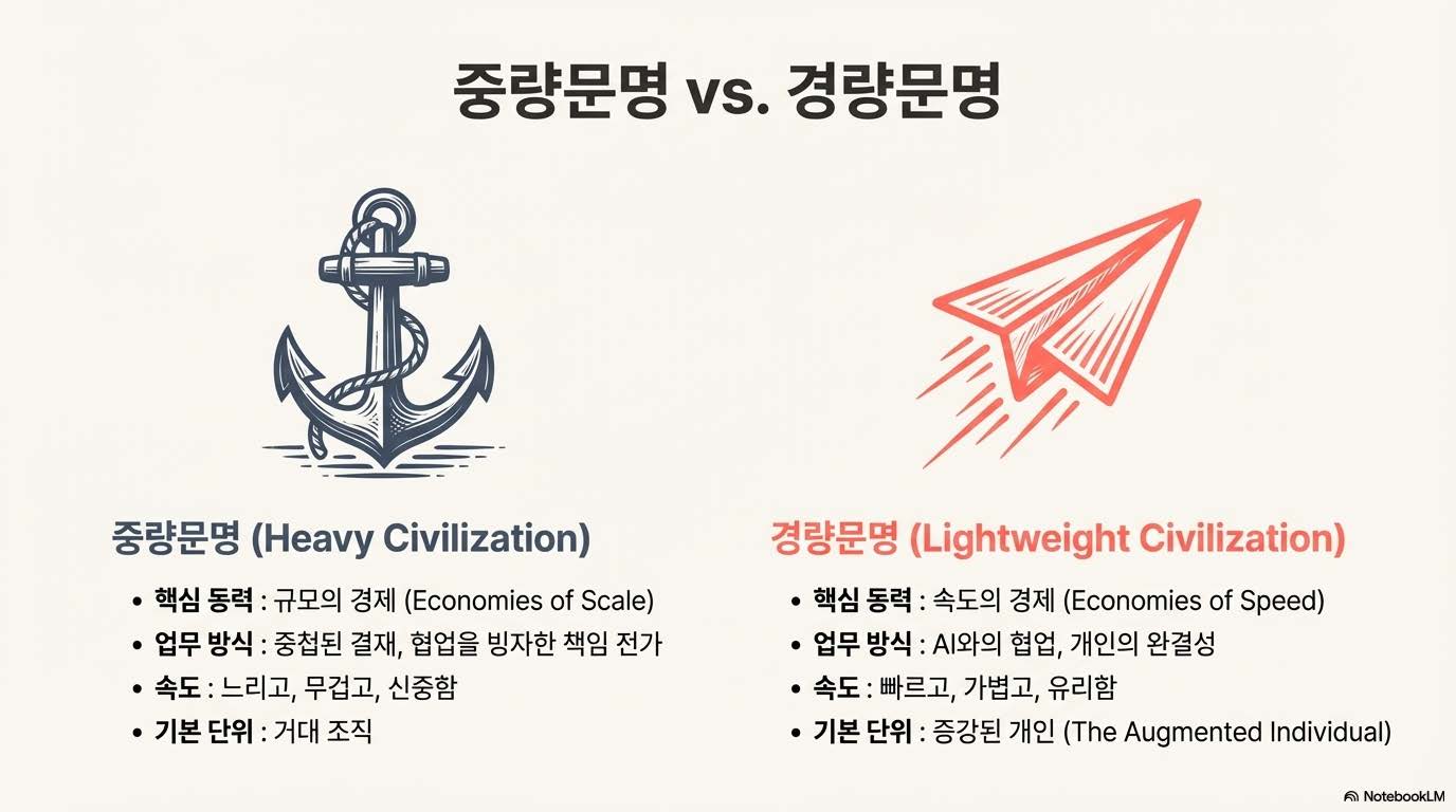 우리는 지금까지 거대한 자본과 인력을 투입해 무언가를 쌓아 올리는 ‘중량 문명’의 시대를 살아왔다. 하지만 이제 지능이 범용화되고 협력이 가벼워지면서, 복잡성을 제거하고도 더 큰 성과를 낼 수 있는 **‘경량 문명’**이 도래했다. 과거에는 대기업 같은 거대 조직이 안전하다고 믿었지만, 이제는 비행기처럼 크더라도 구조가 가볍거나 조약돌처럼 작아도 단단한 조직이 살아남는다. 경량 문명은 단순히 규모가 작은 것이 아니라, 의사결정의 단계가 줄어들고 속도가 생긴 문명이다.