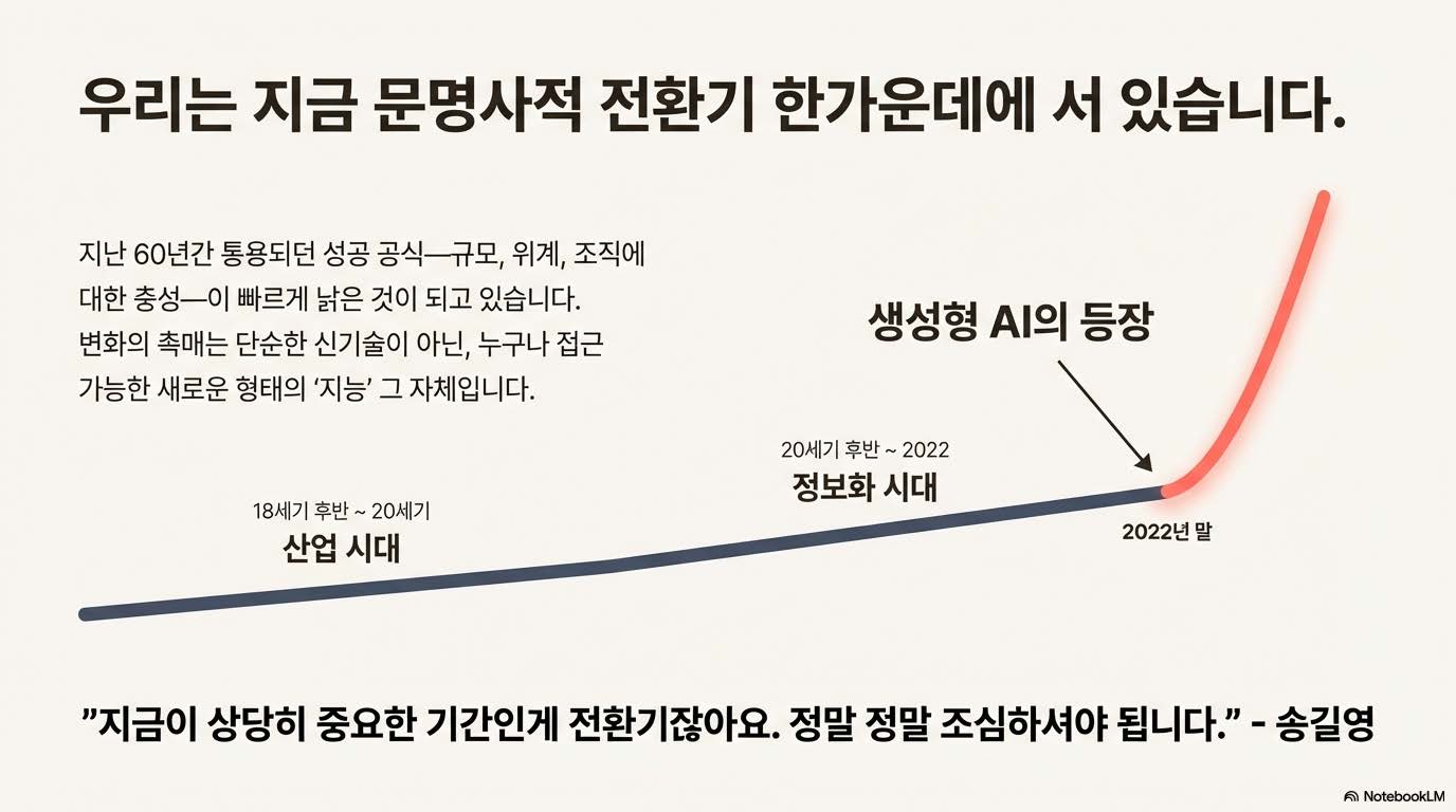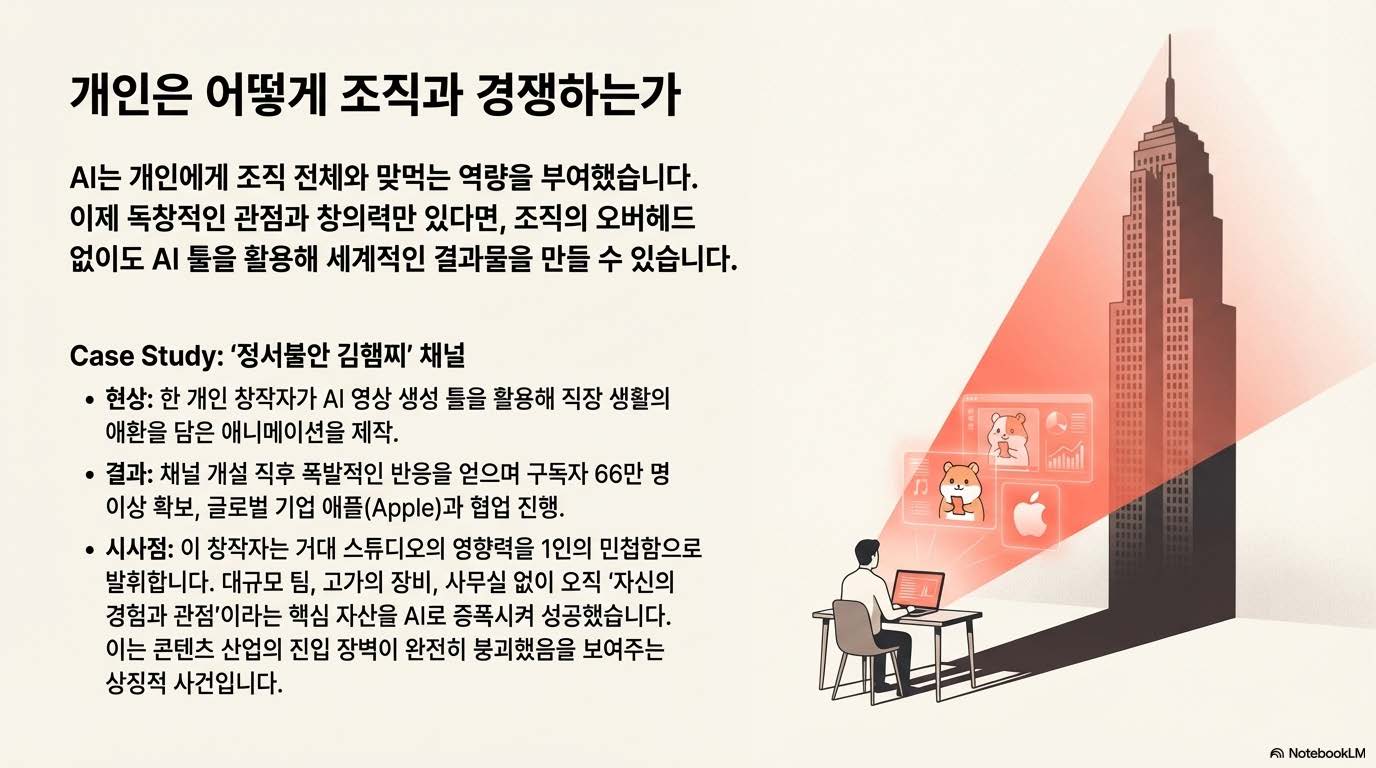 과거엔 ‘대마불사(大馬不死)’ — 큰 기업은 망하지 않는다는 믿음이 있었다. 하지만 지금은 ‘대마필사(大馬必死)’ — 무거우면 반드시 가라앉는 시대로 바뀌었다. 텔레그램은 30명, 미드저니는 40명의 인원으로 전 세계 서비스를 운영하고 있으며, 단 1명이 수천억 원의 기업 가치를 만들어내는 시대다. AI와 같은 도구 덕분에 개인이 기업과 경쟁할 만큼 증강된 것이다. 반면 복잡한 결재 라인과 느린 속도를 가진 조직은 경쟁력을 잃어가고 있다. 기업은 점점 채용을 줄이고, 경량화를 통해 살아남으려는 움직임을 보인다.