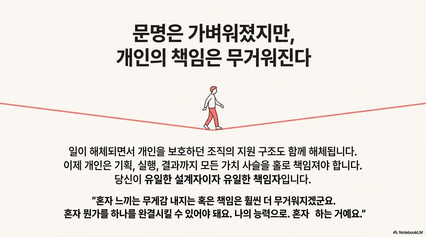 기업들이 경량화를 추구하면서, 신입 공채 같은 대규모 채용은 사라지고 있다. 기업은 사람을 ‘키워서 쓰는’ 대신, 필요할 때 잠깐 쓰고 헤어지는 구조로 움직인다. 이제 개인은 ‘직장’이 아닌 ‘나의 업(Work)’을 정의해야 하는 시대다. 나의 이름으로 살아가는 ‘핵개인’이 되어야 하며, 스스로의 경쟁력을 증명해야 한다. 경량 문명의 협업 규칙은 명확하다 — “준비된 사람만 만나고, 프로젝트 동안 전력을 다하며, 마음이 맞으면 다시 만난다.”