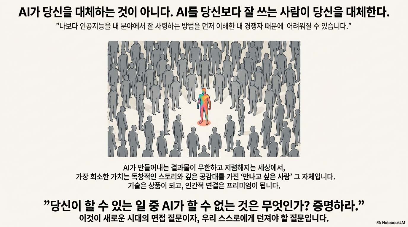 이 변화의 중심에는 AI가 있다. AI는 더 이상 단순한 도구가 아니라 쉬지 않고 일하는 유능한 동료다. IQ 140에 육박하는 지능으로 인간이 하던 업무의 상당 부분을 보조하거나 대체한다. 이제 인간은 단순 실행자가 아니라, AI에게 일을 시키는 관리자이자 기획자가 되어야 한다. AI 활용 능력은 생존의 필수 조건이며, 이를 다루는 태도가 곧 경쟁력이다.